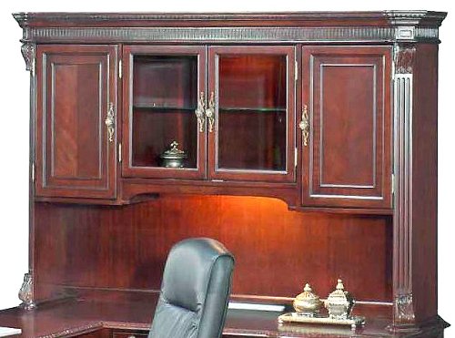 Left and right cabinet each has one adjustable shelf. Center cabinet has one glass adjustable shelf, canister light; task light. Cable accessible. Measures 76-1/2"W x 17"D x 50"H overall. Shpg. wt. 125 lbs. PRICE INCLUDES FREIGHT! (Truck shipment - See Terms & Conditions).